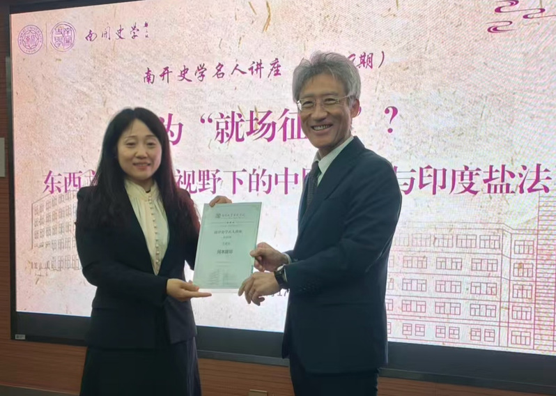 讲座开始前,王美平教授代表历史学院向冈本教授颁发了“南开史学名人讲座主讲人”纪念证书,对冈本教授的学术合作表示感谢。