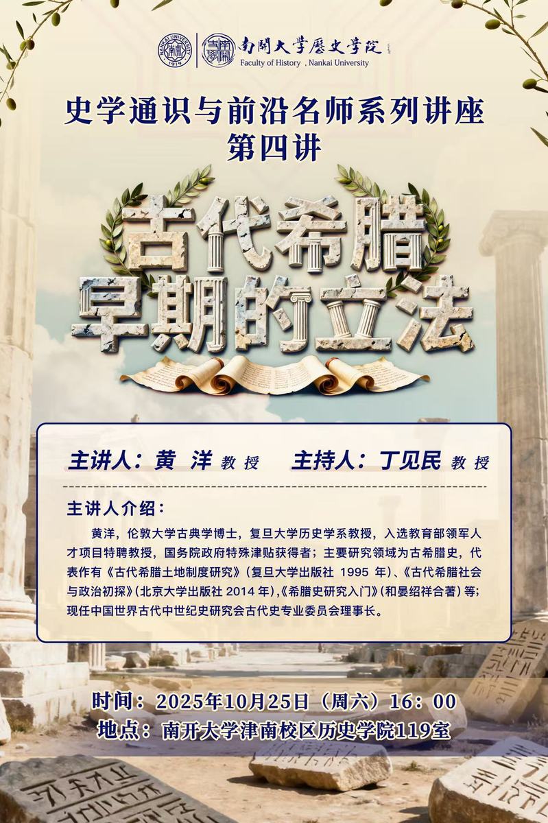 黄洋,伦敦大学古典学博士,复旦大学历史学系教授,入选教育部领军人才项目特聘教授,国务院政府特殊津贴获得者;主要研究领域为古希腊史,代表作有《古代希腊土地制度研究》(复旦大学出版社1995年)、《古代希腊社会与政治初探》(北京大学出版社2014年),《希腊史研究入门》(和晏绍祥合著)等;现任中国世界古代中世纪史研究会古代史专业委员会理事长。