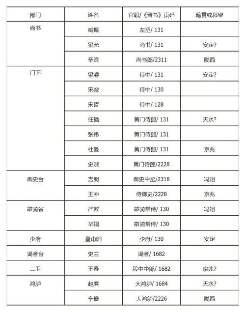 关于表1中诸人的郡望籍贯,郡望或籍贯一栏加 “?” 者,史籍虽未明确记载,但很可能出自相应的大族;空缺者难以推知出处。尽管朝官的实权不大,但总体上出身关陇豪右者仍占多数。建兴四年(316)十一月,司马邺及其群臣被俘至汉国都城平阳,“尚书梁允、侍中梁濬、散骑常侍严敦、左丞臧振、黄门侍郎任播、张伟、杜曼及诸郡守并为曜所害”,西晋残余政权也最终灭亡。