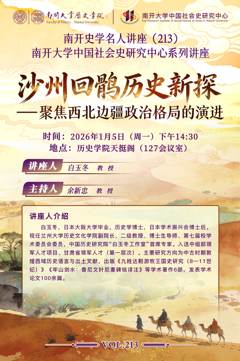 主讲人介绍:白玉冬,日本大阪大学毕业,历史学博士,日本学术振兴会博士后。现任兰州大学历史文化学院副院长、二级教授、博士生导师、第七届校学术委员会委员,中国历史研究院“白玉冬工作室”首席专家。入选中组部领军人才项目,甘肃省领军人才(第一层次)。主要研究方向为中古时期敦煌西域历史语言与出土文献,出版《九姓达靼游牧王国史研究(8-11世纪)》《牢山剑水:鲁尼文叶尼塞碑铭译注》等学术著作6部,发表学术论文100余篇。
