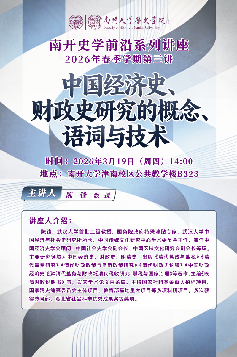 陈锋,武汉大学首批二级教授,国务院政府特殊津贴专家,武汉大学中国经济与社会史研究所所长、中国传统文化研究中心学术委员会主任,兼任中国经济史学会顾问、中国社会史学会副会长、中国区域文化研究会副会长等职。主要研究领域为中国经济史、财政史、明清史。出版《清代盐政与盐税》《清代军费研究》《清代财政政策与货币政策研究》《清代财政史论稿》《中国财政经济史论》《清代盐务与财政》《清代税收研究:赋税与国家治理》等著作,主编《晚清财政说明书》等,发表学术论文百余篇。主持国家社科基金重大招标项目、国家清史编纂委员会主体项目、教育部基地重大项目等多项科研项目,多次获得教育部、湖北省社会科学优秀成果奖等奖项。