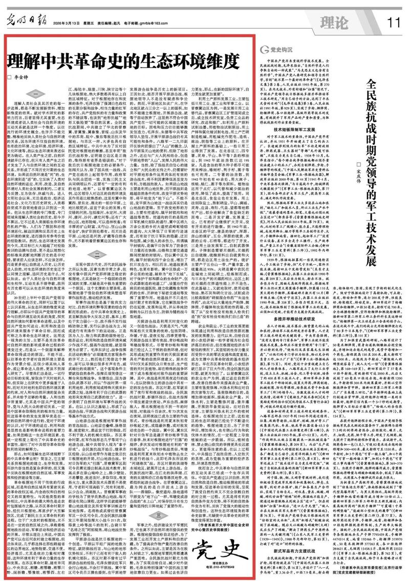 20世纪上半叶中国共产党领导的伟大革命的历史,同样可以置于以上认识系统,从生态环境的维度来进行理解,亦即从中国共产党领导的革命与自然环境互动关系的角度,探究自然环境如何影响革命进程,以及中国共产党如何适应、利用和改造自然环境来服务于革命目标,因而或可称之为革命生态环境史。运用这一视角的主旨,主要不是关注革命对自然环境的影响或革命过程的环境变迁史,而是从一个侧面来解释革命取得成功的原因。不能不说,以往革命史学者对自然环境主要是作为背景介绍,还很少将其纳入革命,或让革命进入自然,更谈不到深入研究了。尽管我们总是说,一切行动目标的实现,皆取决于天时地利人和,但实际上在研究中更多偏重于人和,而对天时地利也即自然环境因素的约束,对人和与自然环境的复杂关系,并未给予足够的考量。人和当然非常重要,尤其是中国共产党的领导,党与人民大众的密切关系,一定是中国革命取得胜利的根本性力量,但这场革命的发生发展毕竟是在一定的自然环境中进行的,党对于环境的认识,对于环境的适应、利用和改造显然也是影响革命进程的重要力量,如果忽略这一生态环境因素,也就一定程度上简化了中共革命史的丰富性,弱化了对中共领导革命取得胜利结局的解释力。