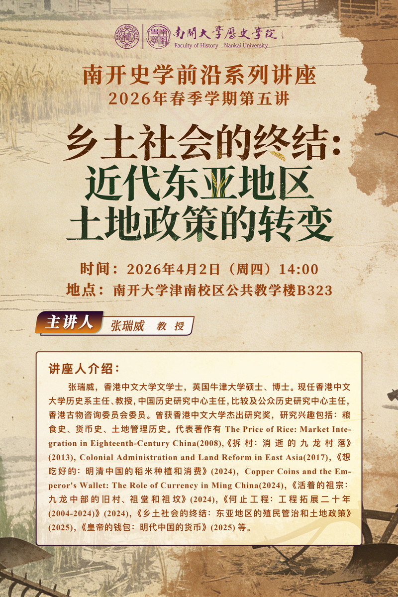 讲座预告丨南开史学前沿系列讲座 2026年春季学期第五讲《乡土社会的终结:近代东亚地区土地政策的转变》