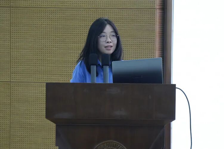 南开大学陈馨怡作为本次论坛的视觉设计发言,分享海报设计的理念。她表示,本次论坛的海报以时空叠面为核心概念,融合历史学前沿探索与未来图景,在人文积淀与科技浪潮间架起桥梁。海报的主色调深空蓝隐喻历史长河,标题用小篆字体锚定历史学古典气质,悬浮时钟象征时空维度与新范式,展翅燕子象征青年学生。在延续经典视觉标识与权威感基础上,融合科幻美学语言,达成不突兀的未来感,是对历史研究的温柔重构。